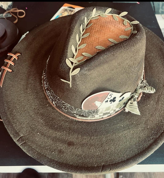 Distressed Dark Green Hat with brown & green band, leather topper, cards & feathers.